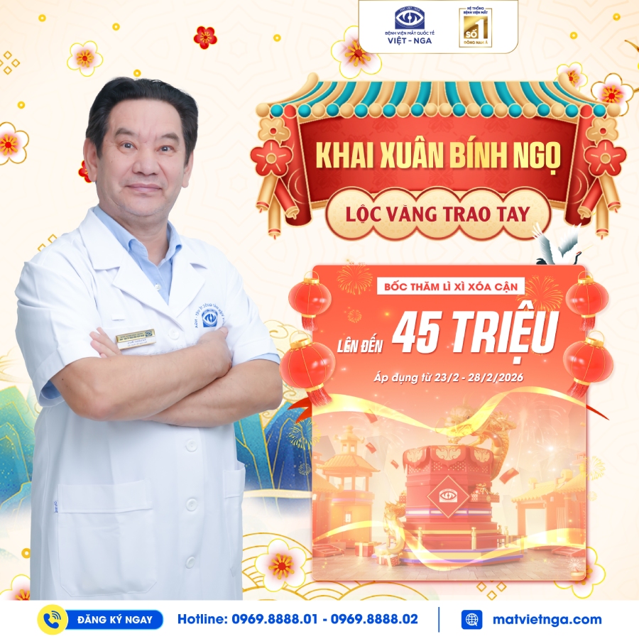 Nhân dịp khai xuân Bính Ngọ 2026, Bệnh viện Mắt Quốc tế Việt – Nga Hà Nội triển khai chương trình ưu đãi đặc biệt “Hái lộc đầu xuân – năm mới tầm nhìn mới”, mang đến cơ hội cải thiện thị lực với chi phí ưu đãi hấp dẫn dành cho khách hàng phẫu thuật trong dịp đầu năm mới.