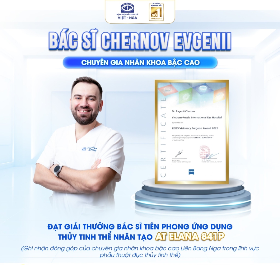 Trong đó, BS. Evgenii Chernov được đánh giá là một trong những chuyên gia có chuyên môn giỏi, giàu kinh nghiệm, có nhiều đóng góp trong việc ứng dụng hiệu quả thấu kính AT ELANA 841P. Trước đó, vào năm 2024, ông từng được ghi nhận là phẫu thuật viên có số lượng ca phẫu thuật đục thủy tinh thể đa tiêu và loạn thị nhiều nhất khu vực miền Bắc Việt Nam.