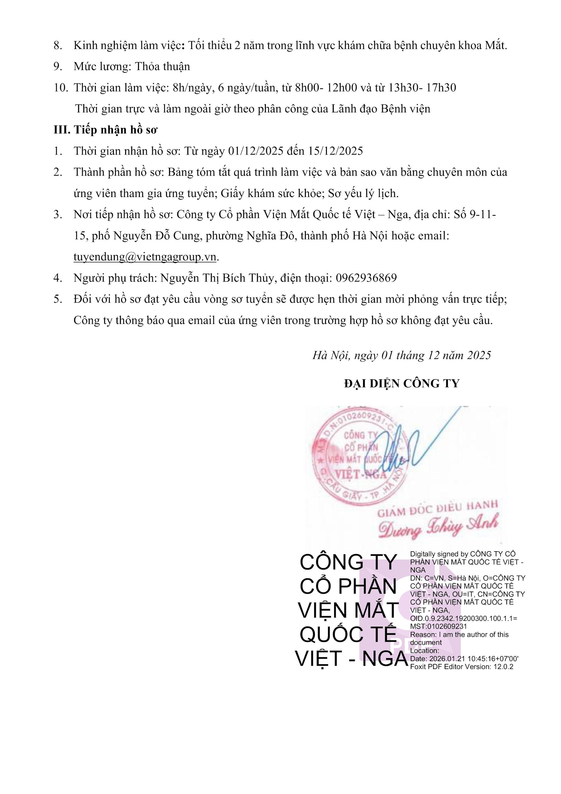 Căn cứ nhu cầu hoạt động và kế hoạch tuyển dụng nhân sự, Công ty Cổ phần Viện Mắt Quốc tế Việt - Nga thông báo nhu cầu tuyển dụng lao động vị trí như sau: